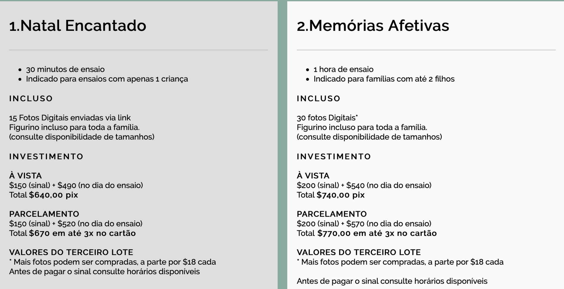 2. Não entregaremos fotos sem edição. A CONTRATANTE declara estar ciente que serão entregues as fotos contratadas do pacote escolhido mediante a escolha na galeria de seleção. Fotos avulsas poderão ser adquiridas, a parte, pelo valor de: R$18,00 por foto.